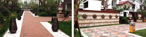 據楊經理介紹,紫金東郡小區里的鋪裝材料主要以橙紅色的燒結磚和仿古磚為主,燒結磚具有承重量大和隔聲性強的特點,是小區園路鋪裝的優良選擇,此外,紅色又與建筑的整體色調相搭配,有種渾然一體的效果感;而仿古磚除了具有防水、防滑、耐磨等特性外,還具有獨特的古典韻味,更能營造出歲月的滄桑和厚重感。在鋪裝方式上,有的是道路中間用橙紅色的燒結磚,兩邊鋪設白色的石子,營造一種居家庭院的溫馨感;有的是正方形的仿古磚與黑色的石子,一紅一黑,相映成趣;還有的用白色的仿古磚作道路兩側的點綴,風格自成一體。純美的色彩、流暢的線條、些微的暖調,不同的道路上別具特色的圖案,使人走上去踏實、安穩而又感古樸、雅致,成為不斷蜿蜒的腳下風景。