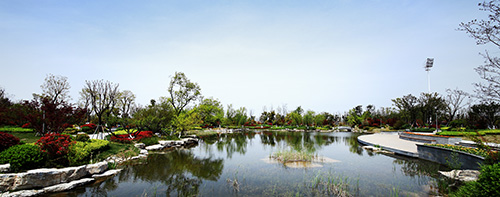 據(jù)夏修智介紹,奧體公園是工程的主要景觀節(jié)點,位于奧體中心西北側(cè),面積約5萬平方米,是一座集娛樂、運動為一體的特色濱水運動公園,也是整個奧體中心的“綠肺”。一條蜿蜒的河流將公園劃分為東部運動區(qū)和西部休閑公園區(qū)。運動區(qū)緊挨訓(xùn)練中心,東側(cè)便是足球場、籃球場和排球場,運動后就能感受到融入大自然的清新;休閑公園區(qū)包括入口廣場、樹陣廣場、以及河水匯聚而成的小人工湖,湖邊蘆葦迎風(fēng)擺動,湖水清澈見底,鵝卵石鋪就的湖底清晰可見。整個奧體公園以中國古典園林為主、回歸自然的組團(tuán)式造景手法,強(qiáng)調(diào)休閑、幽靜、生態(tài)自然。從西入口廣場的草坡,逐漸過渡到觀賞性強(qiáng)的觀花、觀葉園林樹種,配合灌木、草木、地被形成人為景觀,從西到東植物次第減少,層次不斷變化,形成了從自然生態(tài)狀綠化到人工幾何狀綠化的逐漸過渡,讓自然的活力與體育精神融為一體。