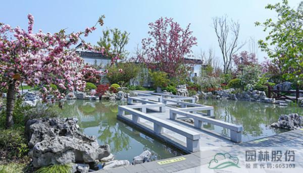 曲折的小橋?qū)@中的水系一分兩半,一邊是平面的水面,一邊是層層跌落的流水,動(dòng)靜結(jié)合,意蘊(yùn)悠遠(yuǎn),帶給人們更加豐富的景觀體驗(yàn)。而不同的植物配置手法,也讓海棠顯得更加豐姿婥約,優(yōu)美動(dòng)人。
