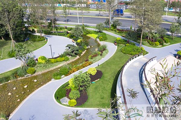 融入海綿城市理念打造的旱溪景觀,用鵝卵石鋪裝,點綴景石,岸邊種植造型水蠟、楊梅、蘆葦、蒲草、三角梅、黃金葉、黃金榕、朱蕉、扶桑花、變葉木、紅千層等當地鄉土植物,打造生態環保的地域特色景觀風貌。